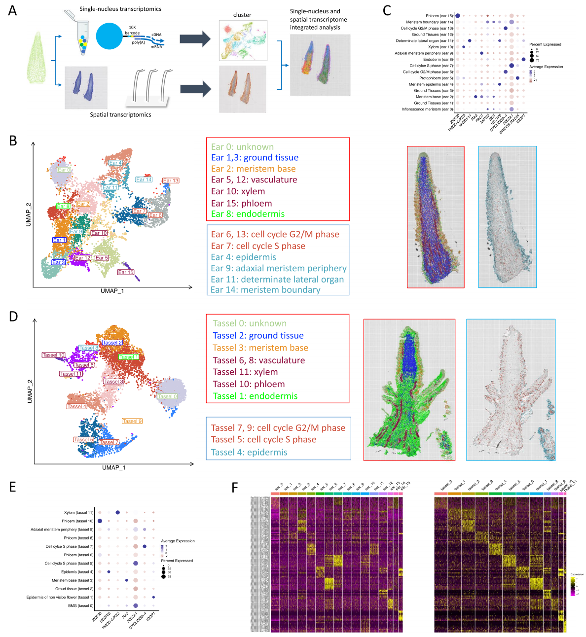 圖5-基于空間轉錄組學和標記基因的玉米雌穗和雄穗的細胞聚類與細胞類型鑒定