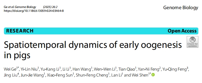 2025年1月,青島農業大學葛偉教授與沈偉教授團隊在學術期刊《Genome Biology》上發表了一篇題為《Spatiotemporal dynamics of early oogenesis in pigs》的研究論文。該研究利用了單細胞RNA測序和空間轉錄組技術,解析了豬早期卵子發生中的基因表達及空間組織特征。研究發現,豬生殖細胞在卵巢中呈“皮質到髓質”分布,且與人類卵子發生過程相似,表明豬是研究人類卵子發生的良好模型。RNA速度分析揭示了顆粒細胞譜系特征,空間共定位分析和細胞通訊分析顯示皮質與髓質區域生殖細胞與體細胞通訊模式不同,特別是NOTCH信號通路和ECM蛋白在調控中起關鍵作用,強調了卵巢微環境對生殖細胞命運的重要性。
