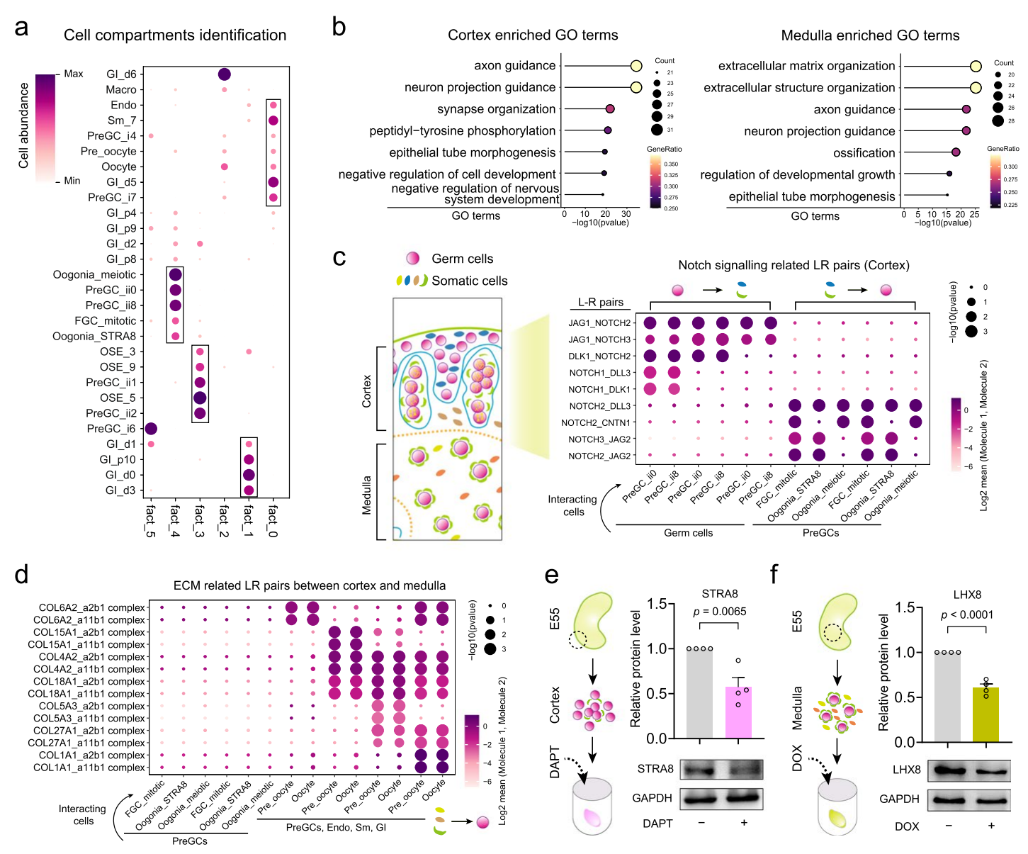 為了進一步驗證細胞通訊分析,研究人員接下來探討了在使用從E55卵巢皮質和髓質中分離的卵巢組織進行體外條件下,補充NOTCH信號抑制劑DAPT和基質金屬蛋白酶抑制劑多西環素是否會影響生殖細胞命運。從E55胎兒卵巢中解剖出皮質和髓質組織,將這些組織進行體外培養,并在用DAPT處理10天后觀察到皮質卵巢組織中減數分裂標志物STRA8的表達水平顯著降低,而髓質卵巢組織則沒有這種情況。相反,在用基質金屬蛋白酶抑制劑多西環素處理10天后,觀察到卵泡形成標志物LHX8的表達水平降低,而在皮質組織中未觀察到可比的影響。綜上所述,這些數據進一步支持了在空間背景下的細胞-細胞通訊分析,并強調了卵巢微環境在調節生殖細胞命運中的重要作用。