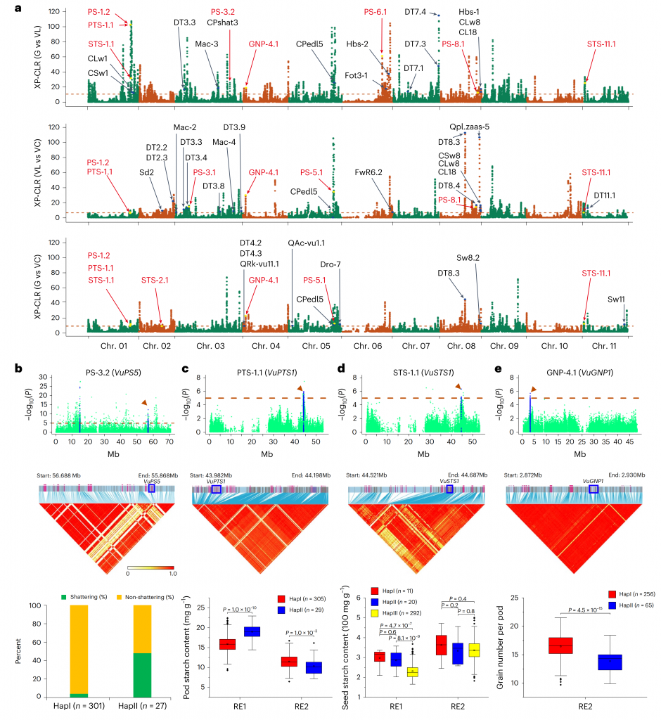 為了研究自然或人工選擇對豇豆分化的影響,作者通過選擇清除分析比較了三個豇豆亞群之間的基因組選擇特征,鑒定出239個與豇豆馴化和改良相關的基因。此外,通過GWAS,挖掘到裂莢性、莢長、單莢粒數、千粒重、可溶性糖、總淀粉和粗蛋白質含量相關基因,并在遺傳群體中驗證。同時揭示了兩個亞種之間基因組結構變異(SVs)的全圖譜,為豇豆在全基因組選擇下的馴化與改良提供了見解。產量性狀和品質性狀的差異基因組選擇將有助于建立糧用豇豆和菜用豇豆雙向改良的遺傳資源。