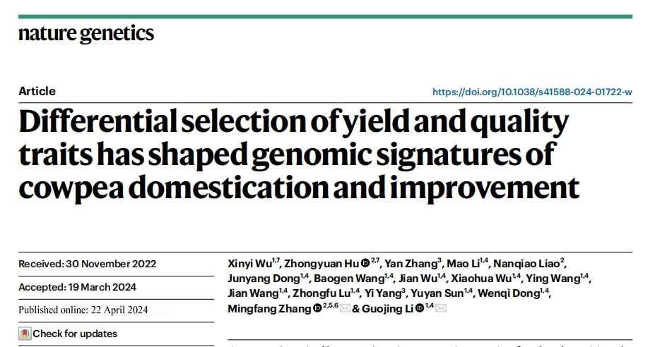 實驗方法:菜用豇豆G98,糧用豇豆G323 基因組Denovo;重測序GWAS:344份全世界收集的豇豆核心種質,其中包括342份栽培豇豆(87份糧用豇豆、244份菜用豇豆和11份未知用途豇豆)和2份野生豇豆;Illumina測序,10x深度;基因單倍型驗證:菜用豇豆地方品種 ‘ZN016’ 和菜用豇豆育成品種‘Zhijiang282構建的RIL群體(183 lines)G98和G323構建的F2群體(165 individuals)