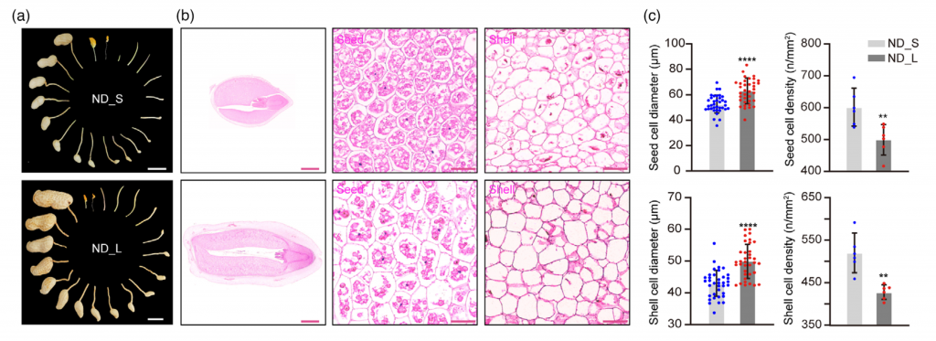 實驗方法:莢果大小/重量差異顯著2份Virginia-type花生材料( ND _ L和ND _ S)雜交,產生遺傳群體;F2:3群體BSA-seq(20+20混池);F6:7 和F6:8群體精細定位;基因克??;系統進化分析;亞細胞定位;免疫熒光;酵母雙雜交;pull-down;CO-IP;番茄擬南芥轉化實驗等。