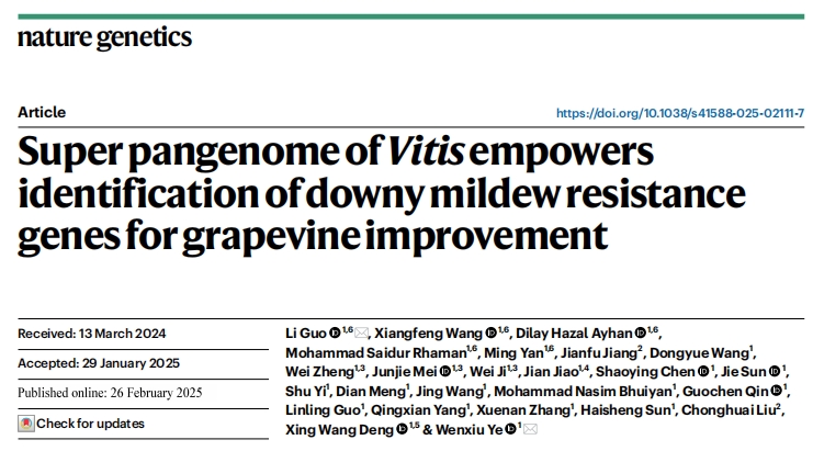 2025年02月26日,濰坊現(xiàn)代農(nóng)業(yè)山東省實驗室、北京大學(xué)現(xiàn)代農(nóng)業(yè)研究院葉文秀研究員和郭立研究員團(tuán)隊在國際期刊《自然-遺傳學(xué)(Nature Genetics)》上在線發(fā)表了題為Super pangenome of Vitis?empowers identification of downy mildew resistance genes for grapevine improvement的研究成果。作為葡萄科研領(lǐng)域里程碑式的重大突破,繪制了涵蓋葡萄屬的歐亞、北美和東亞世界三大種群的72個葡萄種質(zhì)材料的單倍型超級泛基因組圖譜,揭示葡萄屬豐富遺傳多樣性和雜交歷史,基于葡萄多組學(xué)數(shù)據(jù),挖掘到葡萄霜霉病抗性相關(guān)遺傳變異和抗病基因,加速葡萄精準(zhǔn)分子育種,開啟葡萄種質(zhì)創(chuàng)新和利用新時代。百邁客生物為該研究提供了基因組、hic、轉(zhuǎn)錄組等測序服務(wù)。