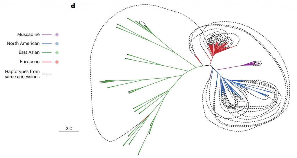 鑒于葡萄基因組因頻繁雜交而具有的高度雜合性,單倍型基因組不僅能精確解析雜合區(qū)域序列,而且對分析葡萄的育種歷史也至關(guān)重要。該研究構(gòu)建了單倍型系統(tǒng)發(fā)育進(jìn)化樹,揭示了葡萄屬植物復(fù)雜的育種歷史和豐富的遺傳多樣性。結(jié)果顯示,北美和歐洲品種存在較多內(nèi)部雜交,而東亞品種的內(nèi)部雜交較少,跨大洲雜交事件有限(圖2)。特別是東亞葡萄極少被開發(fā)的遺傳多樣性,表明了其潛在的巨大育種價值。此次發(fā)布的東亞野生葡萄基因組為葡萄遺傳育種研究提供了強(qiáng)有力的資源支持。
