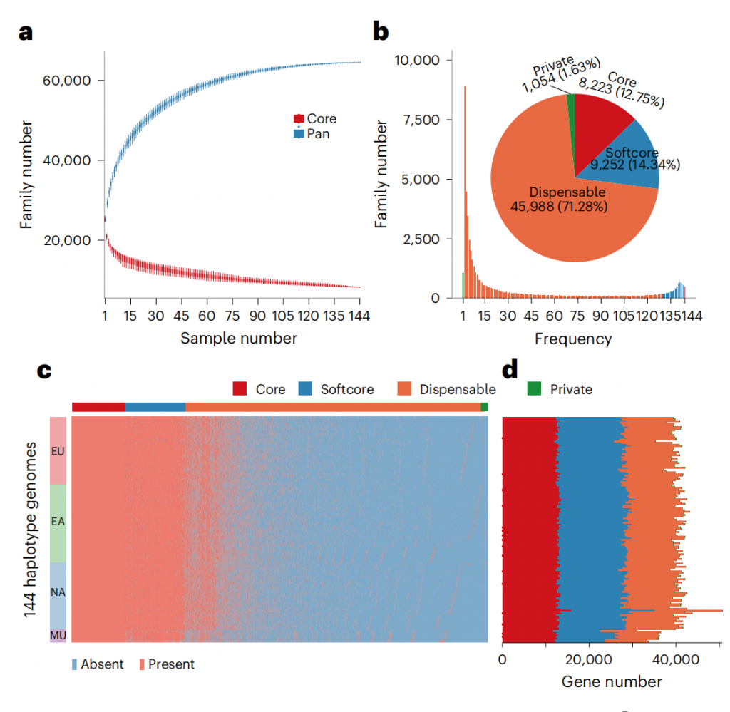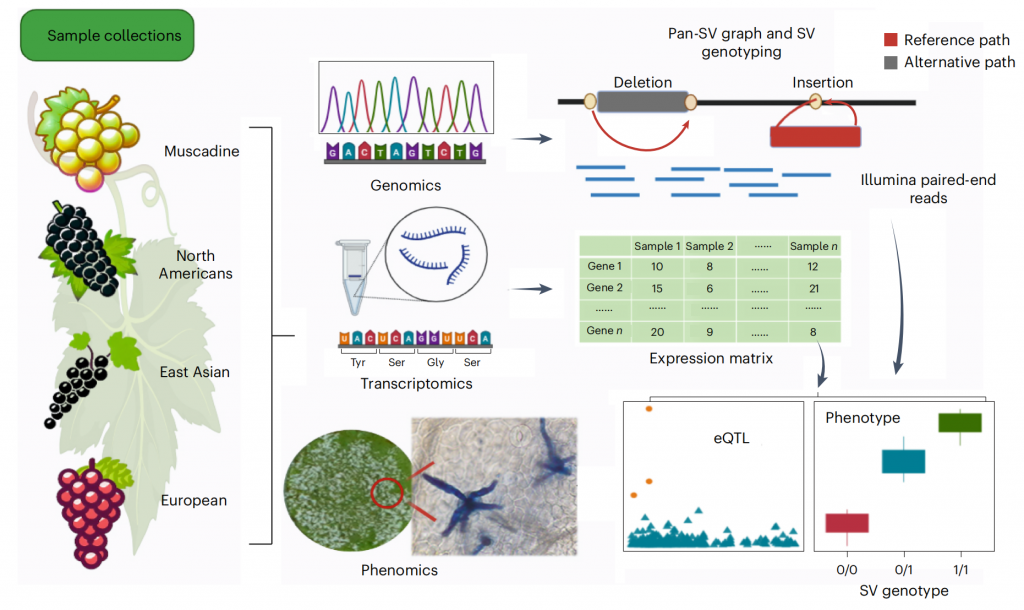 葡萄作為最古老的馴化作物之一(約公元前11,000年),漫長的持續(xù)馴化和多年的育種改良導(dǎo)致現(xiàn)代葡萄品種的遺傳多樣性縮小和抗性丟失,使其易受病蟲、逆境等各種不利條件的影響。近年北美葡萄泛基因組(Genome biology, 2023),歐洲葡萄泛基因組(Nature Genetics, 2024)的相繼報道,野生葡萄以其豐富的遺傳多樣性和超強(qiáng)的抗性基因再次受到關(guān)注,但以大群體染色體級基因組組裝為基礎(chǔ),涵蓋主要品種,特別是包含東亞野生種葡萄的屬級泛基因組一直未見報道。因此構(gòu)建涵蓋整個葡萄屬的泛基因組將成為了解葡萄遺傳多樣性、開展功能基因組學(xué)研究、識別隱性遺傳特性以及葡萄精準(zhǔn)改良的關(guān)鍵資源。