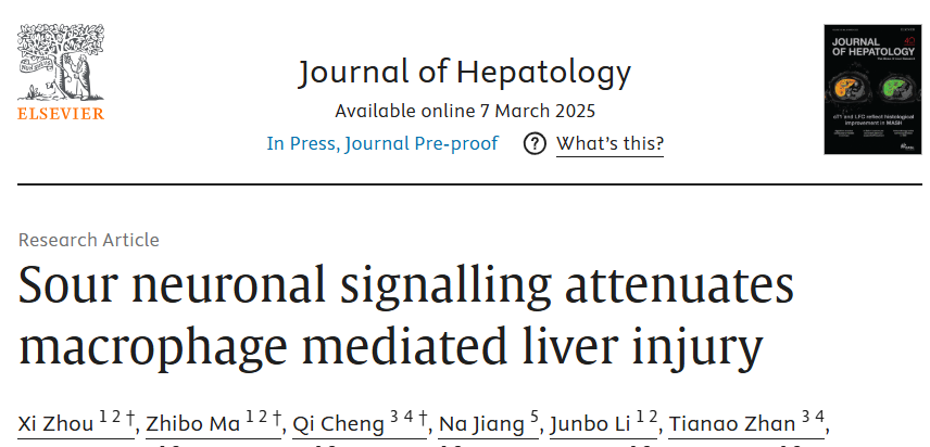 2025年3月,華中科技大學同濟醫學院附屬同濟醫院器官移植研究所蘭培祥教授、陳知水教授和肝臟外科程琪教授研究團隊在Journal of Hepatology發表題為”Sour Neuronal Signalling Attenuates Macrophage Mediated Liver Injury”的研究論文。研究使用單細胞轉錄組測序技術等多種技術,深入闡述人鼠中減輕肝缺血再灌注損傷的腦-肝軸調控通路,發現酸味刺激竟然可以通過神經信號緩解肝臟損傷!這一發現不僅為肝臟疾病的治療提供了新思路,還從現代科學的角度驗證了中醫“酸入肝”的理論。