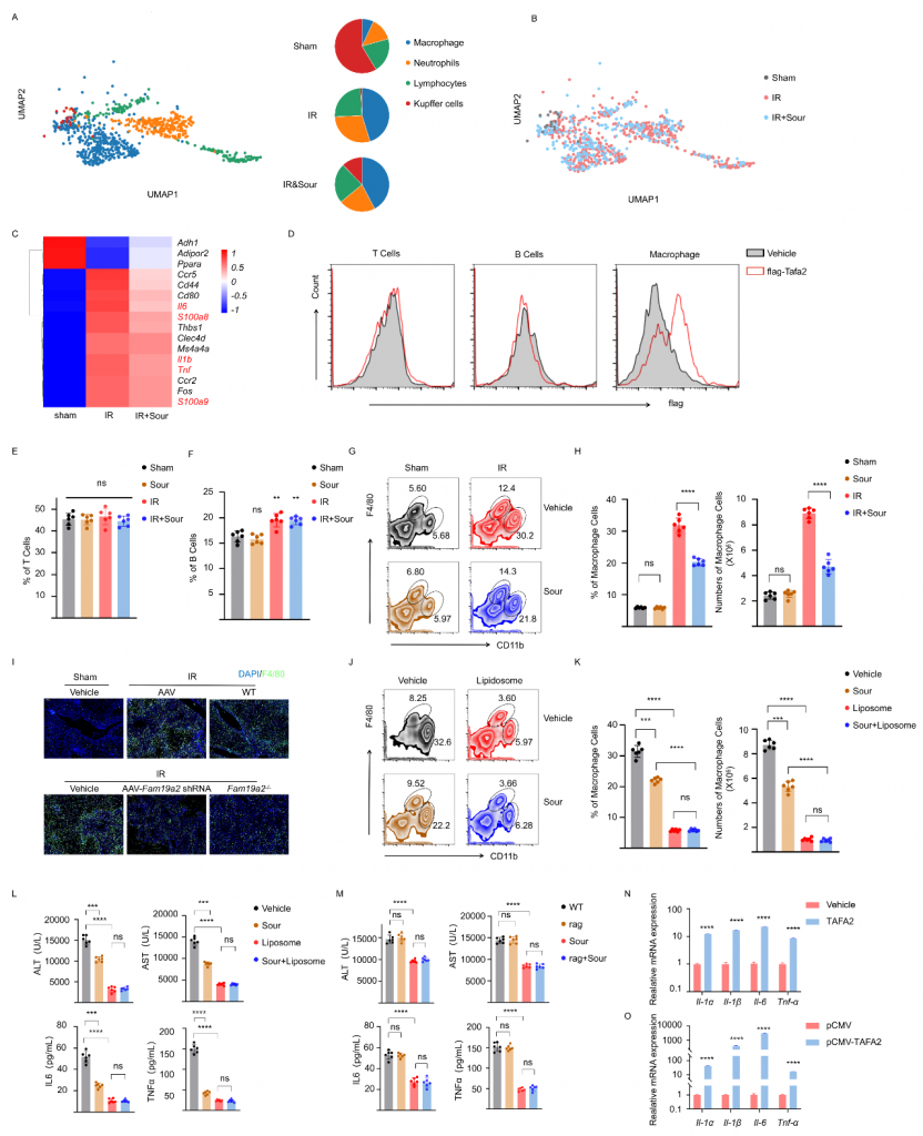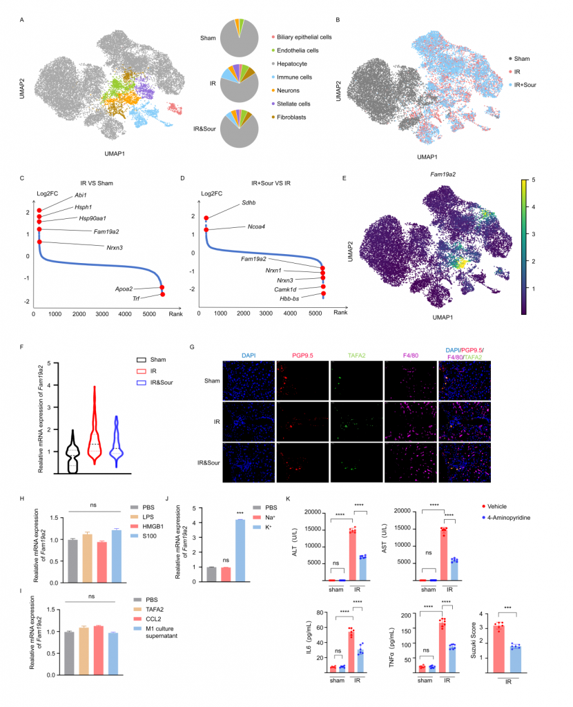 對肝IRI小鼠、酸刺激后肝IRI小鼠及sham(假手術)小鼠的肝臟和CG進行單細胞核轉錄組測序,結果顯示IRI引起肝細胞和神經元基因表達譜發生變化,IRI肝中免疫細胞數量增加,但酸刺激后IRI樣本中免疫細胞數量減少。神經元較為特異性地表達TAFA2,IRI可引起肝神經元TAFA2表達水平增加,但酸刺激使得TAFA2表達水平降到與sham對照組相近水平。實驗發現鉀離子可引起小鼠海馬神經元細胞系HT22顯著高表達TAFA2,使用鉀離子通道抑制劑可減輕肝損傷,支持酸刺激通過神經系統減輕肝損傷的假設。進一步的,使用慢病毒敲低神經元TAFA2表達水平或使用TAFA2敲基因鼠,發現IRI引起的肝組織損傷、巨噬細胞浸潤以及血清標志物水平降低,表明TAFA2在肝IRI中有著重要作用。