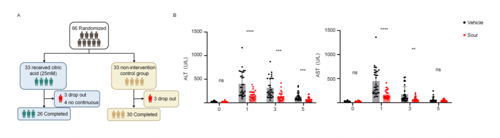 為了確認酸刺激在人類肝IRI中的作用,研究者進行了開放、隨機、空白對照臨床試驗(ChiCTR2400088096),包含多種良性/惡性肝腫瘤、肝外傷、膿腫、囊腫和包蟲病,由于手術期間門靜脈短暫阻斷以減少肝切除過程中出血,導致肝出現缺血再灌注損傷。干預組33名患者,術前24h開始,每8h給與新鮮的25mM檸檬酸(持續5min),對照組33名患者不接受酸刺激,剔除6名術中肝缺血超過30min患者以及4名依從性差患者,肝切除術后第1/3/5天對患者肝功能進行評估,結果顯示酸刺激組血清ALT和AST水平顯著低于對照組,高ALT水平(>500 U/L)患者數量也顯著更低,這些結果表明酸刺激可減輕人類肝切除術引起的肝IRI。