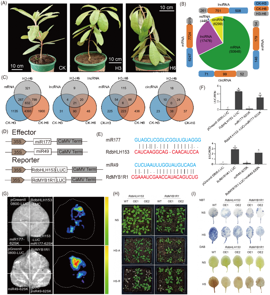 圖2. miRNA和靶基因的全轉錄組分析及功能驗證 (A)R. delavayi的對照(CK)和熱處理(H3和H6);(B)mRNA、lncRNA、miRNA和circRNA的鑒定和差異表達分析;(C)三種比較中特異性和常見的差異表達RNA;(D)效應器和報告器結構圖;(E)miR49和miR177靶點突變示意圖;(F)熒光素酶測定統計。誤差條表示三個重復的SEs(*,p?< 0.05)。(G)熒光素酶成像分析;(H)RdbHLH153和RdMYB1R1的過表達增強了耐熱性。NS表示無熱應激,HS-A表示36 h熱應激,HS-R表示36 h熱處理后在常溫下恢復5天;(I)二氨基聯苯胺(DAB)和硝基藍四氮唑(NBT)染色法檢測轉基因株系和WT在無熱脅迫(NS)和熱脅迫(HS)下的H2O2和O?2。