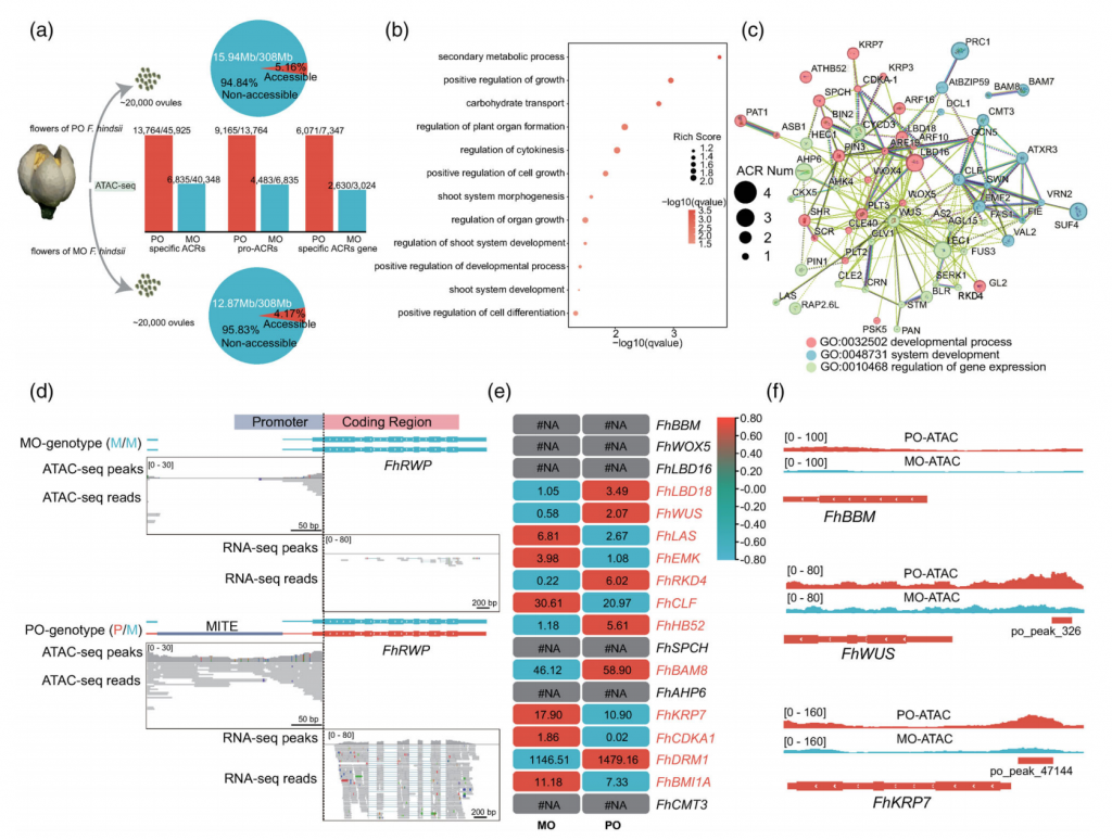先前的研究表明,一個顯性基因FhRWP決定了與微型倒重復轉座因子(MITE)插入相關的不定胚胎的啟動,在PO基因型中FhRWP的啟動子區中鑒定到了特異性ACR,而Mo基因型中不含ACR,該ACR與FhRWP啟動子區域的MITE序列重疊,即MITE序列被FhARID1蛋白結合,這可能是染色質重塑復合體的一個亞基,這些結果表明,FhRWP是可及染色質的決定因素,參與不定胚胎發育,與MITE的插入有關。