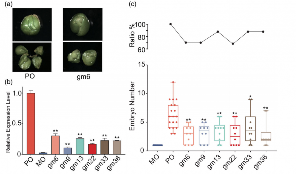 FhRWP基因在胚囊中的表達是特異性和短暫的,可以從受精前7天開始追蹤,直到后10天,作者采用RNAi方法構建了6個干擾系,發現FhRWP在6個干擾系中的表達量相比PO系顯著降低,但顯著高于Mo基因型,且FhRWP表達量降低后不定胚數量也都減少了,這些結果提示,受FhRWP控制的不定胚表型可能與基因表達的劑量效應有關。