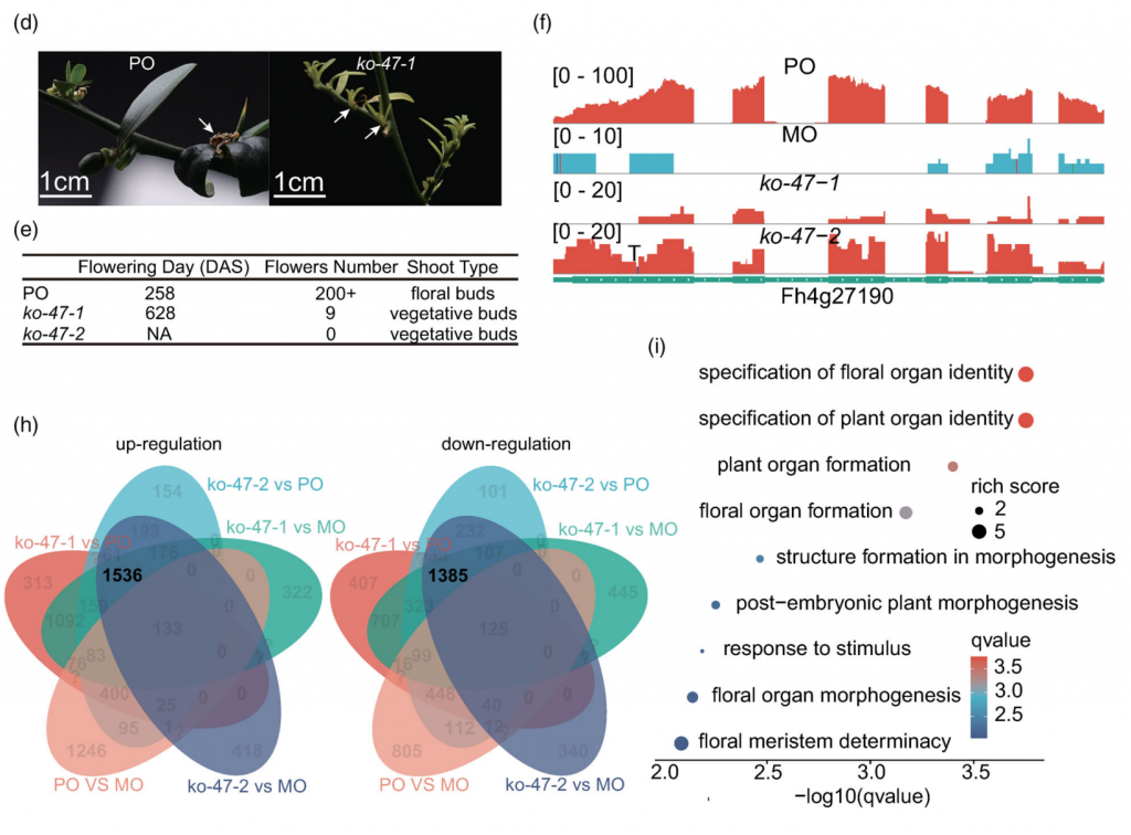 作者之前的研究顯示的雜合子插入MITE啟動子區域和一個FhRWP的CDS序列區域SNP(C-G),導致這個基因的分裂成兩個單倍型,M等位基因(MITE)和P等位基因(沒有MITE)。根據Mo和PO腋芽的轉錄組結果,作者發現PO中RWP轉錄本高表達P等位基因,而Mo中M等位基因表達較小,于是作者構建了CRISPR/Cas9載體,以敲除FhRWP,結果表明,插入MITE可以通過促進含有MITE的P等位基因的表達,同時減少不插入MITE的M等位基因的表達,從而改變該基因的表達模式。雖然FhRWP在ko-47-1和ko-47-2中的FhRWP的表達下降到與Mo一致的水平,但P等位基因突變導致的過早終止導致了FhRWP功能的喪失,因此,ko-47-1和ko-47-2植株表現出新的表型,如生長遲緩和花芽分化失敗。