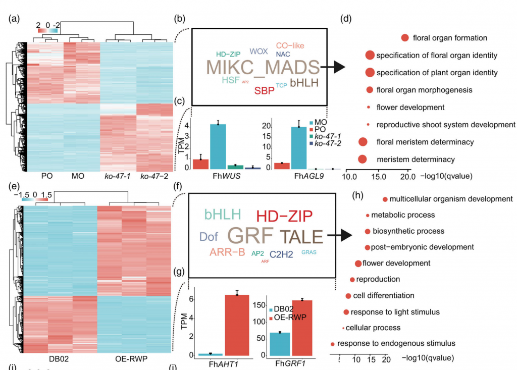 多項實驗結果表明,FhRWP在協調細胞命運和啟動植物再生和繁殖過程中起著關鍵作用,因此,該研究對腋芽MO/PO胚珠的表達數據進行了整合的轉錄組分析。差異基因在花器官發生和繁殖相關的生物過程顯著富集,其中來自MADS和WOX等基因家族的轉錄因子,包括FhWUS和FhAGL6,均顯著富集,在過表達的愈傷組織中,共鑒定出354個差異表達的轉錄因子,GO注釋顯示與胚胎后發育和再生相關的過程顯著相關。值得注意的是,屬于GRF和TALE等基因家族的轉錄因子,包括FhAHT1和FhGRF1,表現出顯著的富集,這些基因已被廣泛報道參與光形態建成、葉片發育等信號通路。