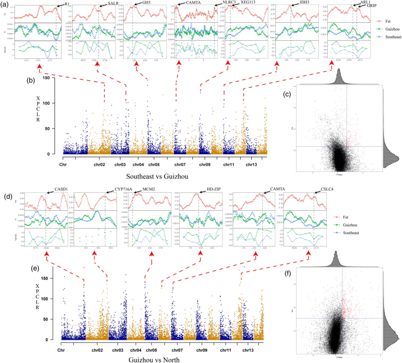 揭示關鍵適應性基因:在貴州和華北群體中,研究檢測到與干旱、寒冷和病害抗性相關的選擇信號基因(如CYP716A, CAMTA,HD-ZIP等),解釋了不同地區無患子群體的環境適應能力差異。