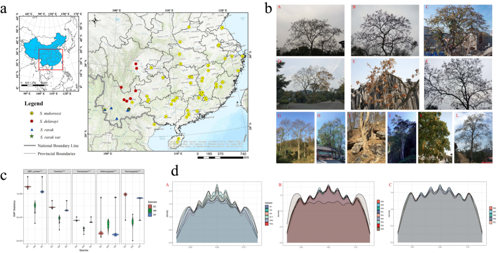 圖1?無患子屬種質分布及單核苷酸多態性(SNP)?統計分析