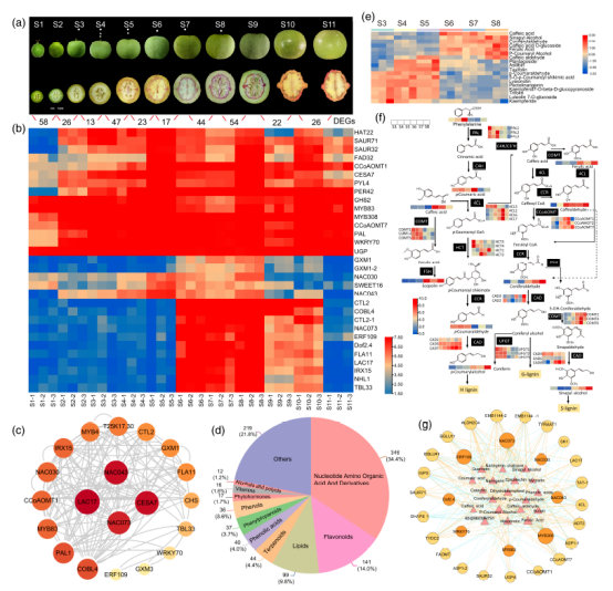 圖2-核桃果殼/內(nèi)果皮十一個(gè)發(fā)育階段基因轉(zhuǎn)錄調(diào)控網(wǎng)絡(luò)及動態(tài)形態(tài)變化