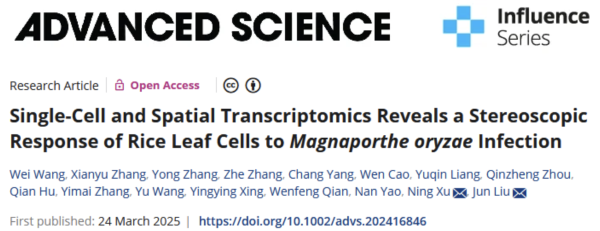 2025年3月24日,中國農業大學植物保護學院劉俊團隊在國際綜合性期刊《Advanced Science》上,在線發表了題為“Single-Cell and Spatial Transcriptomics Reveals a Stereoscopic Response of Rice Leaf Cells to?Magnaportheoryzae?Infection”的研究長文,該研究利用單細胞核轉錄組測序和空間轉錄組測序技術,深度分析了水稻-稻瘟菌互作下的細胞空間立體響應,并構建了一個全新的水稻-稻瘟菌互作單細胞和時空組轉錄圖譜。