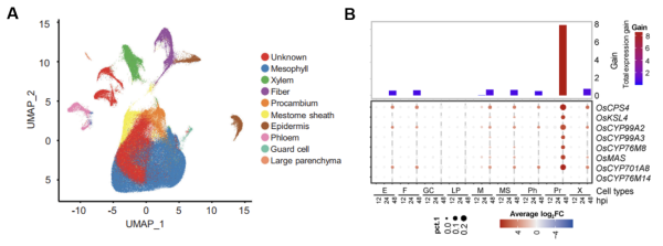 對測序獲得的單細胞數據,結合細胞特異的標志基因,AddModuleScore?軟件和GO富集分析等方法,對水稻的細胞類型進行了分類注釋(圖2A)。基因表達分析發現,維管細胞中的原形成層細胞在稻瘟菌侵染后高度誘導二萜類植保素合成代謝相關基因的表達,其中水稻關鍵植保素momilactone A合成被特異誘導(圖2B),促進了momilactone A在維管組織中積累,可能是抗稻瘟病的關鍵因素。相反,激素途徑和模式分子激發的免疫對抗病性貢獻較弱。