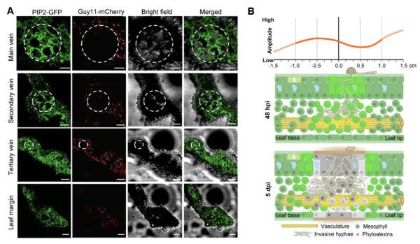 共聚焦顯微鏡觀察結果顯示,稻瘟菌孢子萌發后優先靶向葉脈入侵,但是水稻的維管組織具有較強的免疫,稻瘟菌菌絲無法進一步侵入(圖3A)。時空組測序結果顯示,富含亮氨酸重復序列的(NLR)免疫基因的表達在接種24小時后,葉尖部較葉基部具有更強的積累,表明免疫基因的表達具有極性的特征。綜上所述,該項研究揭示了水稻在稻瘟病菌侵染時免疫基因存在細胞特異性和多維(局部和縱向)的表達模式,為挖掘新的免疫基因提供了重要的數據基礎(圖3B)。