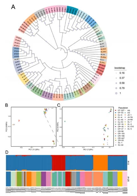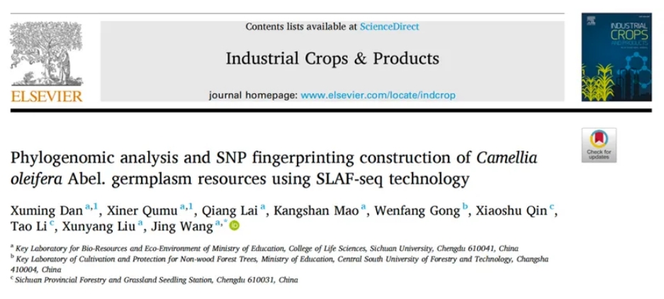 2025年4月2日,Industrial Crops & Products在線發表了由四川省林草局、四川大學生命科學學院王婧教授課題組聯合中南林業科技大學等多家單位合作完成的研究論文,題為” Phylogenomic analysis and SNP fingerprinting construction of Camellia oleifera Abel. germplasm resources using SLAF-seq technology”。該研究利用SLAF-seq技術,對四川省主栽的來自我國南方25個主要油茶品種開展了系統發育和群體基因組學研究,并篩選關鍵SNP標記構建了DNA指紋圖譜。該指紋圖譜的構建有望為我國南方尤其是四川地區油茶種質資源保護、開發利用及品種選育提供關鍵科學依據。