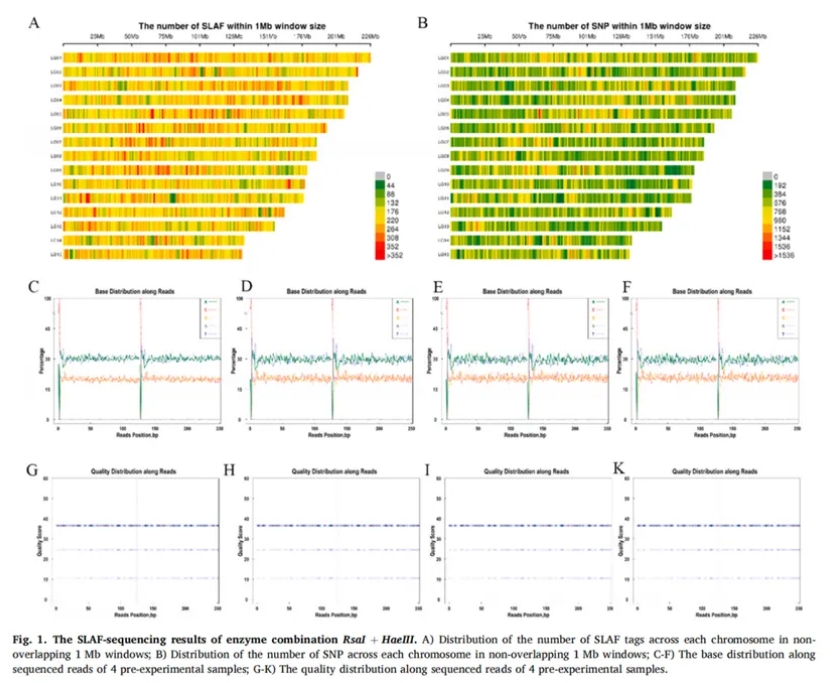 首先,研究共采集25個油茶栽培品種,共100個樣本,利用高通量SLAF-seq建庫策略進行數據獲取。在建庫酶切方案篩選方面,團隊預先開展酶切模擬試驗比較篩選最優組合,Figure 1 顯示,RsaI + HaeIII組合在標簽分布均勻性、多態性與文庫復雜度上表現最佳。共獲得362,152個高質量SLAF 標簽,其中254,357個為多態性標簽,平均GC含量41.30%,平均Q30高達93.44%,顯示測序數據具備極高的可靠性。RsaI + HaeIII雙酶切組合可實現高效的特異性位點擴增與標簽標準化,為后續大規模SNP檢測奠定了數據基礎。