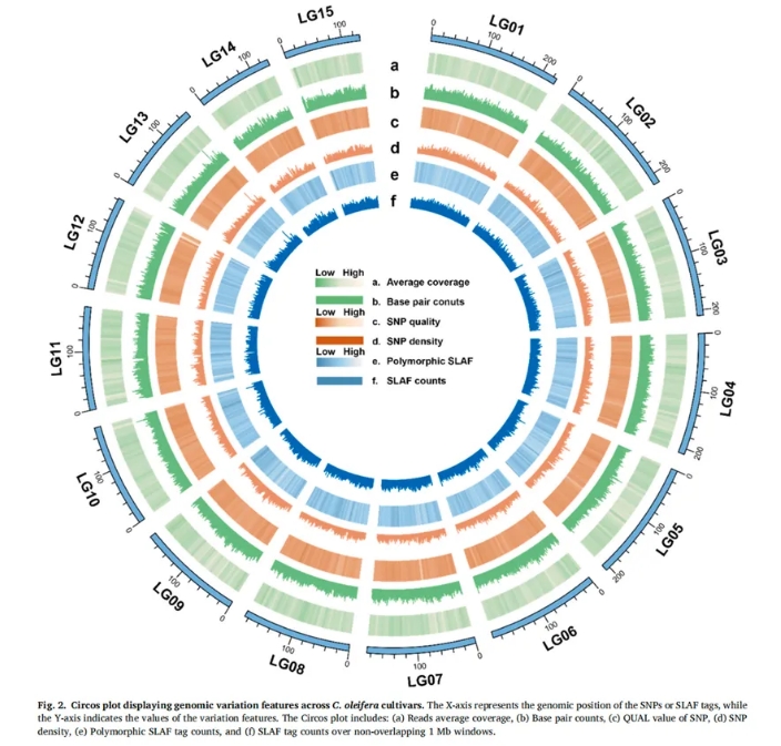 經測序,每個樣本平均測序深度為13.95×,共鑒定出470,397個多態性SLAF標簽,并初步檢測到36,317,329個SNP位點,經過質控過濾后,最終保留了5,685,673個高質量SNP供后續分析。這些SNP廣泛分布于油茶基因組的各個染色體區域,具有較強的代表性和應用潛力,為油茶的遺傳多樣性研究和分子育種提供了寶貴的遺傳資源。 Figure 2展示了SNP位點在各染色體上的分布密度、覆蓋深度和變異質量參數,為后續的遺傳結構分析及品種識別提供了堅實的基礎數據支持。