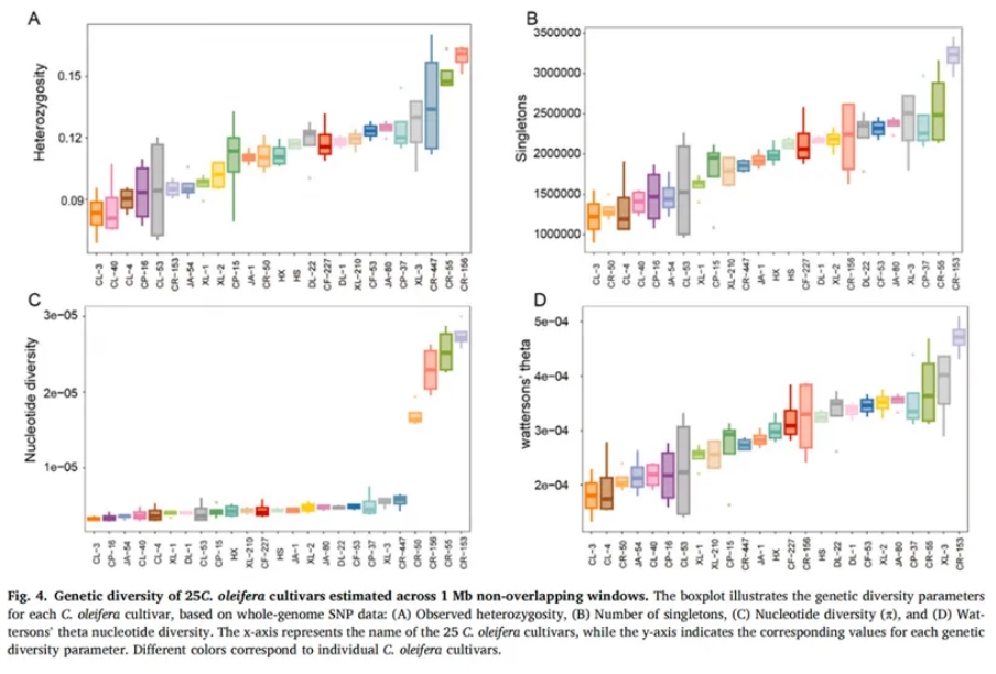 為了全面評估油茶種質資源的遺傳多樣性,研究統計了包括雜合度(Heterozygosity)、核苷酸多樣性指數(π)、單態位點數量(Singleton)以及Watterson’s θ值等關鍵遺傳參數(Figure 4)。結果表明,川榮(CR)系列品種(如CR-153、CR-55)在各項遺傳變異指標上均表現出較高水平,尤其是核苷酸多樣性指數(π)顯著高于其他品種。具體而言,singleton在長林(CL)系列品種(如CL-3、CL-4、CL-40)、翠屏(CP)系列(如CP-16)和江安(JA)系列品種(如JA-54)中較少,而在川榮CR-153和CR-55中則為最多(Figure 4B)。核苷酸多樣性(π)值的差異也較為顯著,川榮品種CR-50、CR-156、CR-55和CR-153的π值明顯高于其他品種,表明川榮系列品種具有較高的遺傳多樣性,可能為油茶品種改良和分子育種提供重要的遺傳資源(Figure 4C)。類似地,Wattersonθ分析進一步揭示了品種間分離位點的變化,川榮CR-153、湘林XL-3和CR-55表現出較高的θ值,與singleton的趨勢一致(Figure 4D)。近交系數(F)分析結果與遺傳多樣性模式一致,顯示川榮CR-156、CR-55和CR-447的F值最低,表明其遺傳多樣性較高,而長林CL系列品種(如CL-3、CL-40、CL-4)的F值較高,反映其遺傳多樣性較低。總體而言,遺傳多樣性分析結果表明,長林(CL)系列品種由于長期的人工選育和馴化,遺傳背景較為單一,表現出較低的遺傳多樣性;而川榮系列品種則保持較高的遺傳多樣性。該研究結果為篩選核心種質資源和制定育種策略提供了有力的遺傳依據。