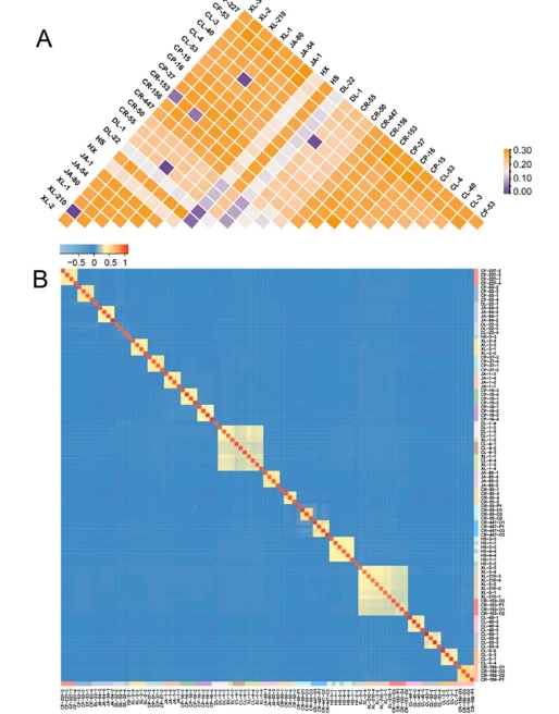 通過計算品種兩兩之間的Fst值與構建遺傳距離矩陣,研究進一步明確了油茶品種間的遺傳分化程度和親緣關系(Figure 5)。Fst值的分析結果顯示,長林CL-4、達林DL-1與湘林XL-1三者之間的Fst值極低(0.0106–0.0110),這表明這些品種可能源自相同或相似的遺傳背景。類似地,川榮CR-153與湘林XL-3、湘林XL-210之間的Fst值也表現出較高的遺傳相似性(0.0036–0.0442),提示這些品種可能具有共同的祖源關系。相比之下,達林DL-22與川榮CR-50(0.0816)、川榮CR-55(0.0870)和達林DL-1(0.0759)之間的Fst值較高,顯示出較為顯著的遺傳分化,反映其與這些品種的親緣關系較為緊密,但仍保持一定的遺傳獨特性。其它品種的Fst值范圍從0.1013到0.2908,表明這些品種的遺傳起源更加多樣,可能涉及不同的地理區域或品種間的較大差異(Figure 5A)。研究人員進一步使用GCTA軟件計算的G矩陣分析,結果顯示大多數油茶品種之間的親緣關系較為明顯,遺傳分化較大(Figure 5B)。然而,一些品種群體的親緣關系值相似,例如XL-1、CL-4與DL-1;CR-153、XL-3與XL-210;華碩HS與華鑫HX,表明這些品種可能源自相同或相近的祖先背景。與此不同,達林DL-22品種在其群體內部未顯示出顯著的親緣關系,反映出其群體內存在較高的遺傳分化。總體而言,這些分析為理解油茶品種的遺傳背景和親緣結構提供了重要依據,揭示了不同品種之間的親緣關系及其遺傳多樣性。