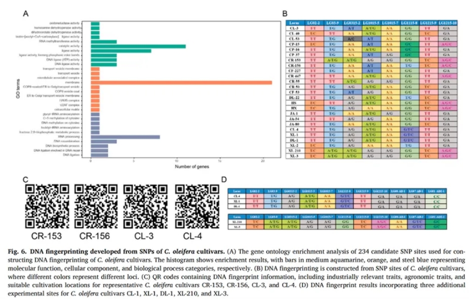 為建立油茶品種的快速鑒定體系,研究人員進一步構建了25個主栽油茶品種的DNA指紋圖譜(Figure 6)。在初步獲得的234個候選SNP中,有196個位點被注釋為功能明確的編碼區域突變,富集于DNA連接、RNA加工、果糖代謝等重要通路(Figure 6A)。為提升區分效率,進一步篩除掉存在多變異干擾或功能不明的位點,最終篩選得到15個核心SNP位點,可有效區分全部25個油茶品種,實現穩定的遺傳身份標識。為確保指紋圖譜的準確性與應用價值,研究通過Sanger測序對15個候選SNP位點進行了引物驗證,最終篩選出8個多態性強、峰型清晰的核心SNP位點用于構建指紋圖譜(Figure 6B)。這些位點主要分布于功能基因區,涉及次生代謝、胚胎發育、自噬調控等關鍵生物過程,如編碼α-萜品醇合酶的LG12_G02320和控制胚胎發育與芽形成的FLA8蛋白基因LG03_G02445等,展現出良好的應用潛力。為進一步提升指紋信息的實用性,研究人員還開發了包含8個位點基因型信息的二維碼系統,其中涵蓋了油脂品質、農藝性狀及適宜種植區域等數據,為油茶品種的數字化管理與選育決策提供便捷、高效的技術支持(Figure 6C)。二維碼系統為油茶品種的數字化管理與選育決策提供了便捷、高效的技術支持。通過將分子標記信息與油茶生產應用相結合,研究成果不僅實現了分類識別功能,還為分子育種提供了重要參考價值。