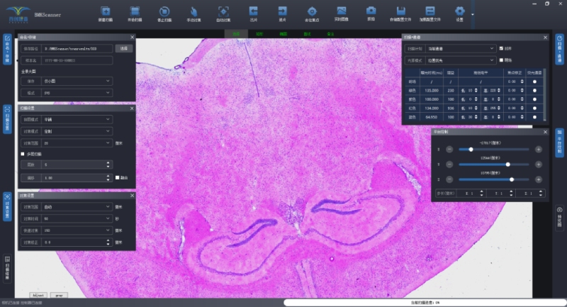 在樣本完成質檢并合格后,需要對研究的目標區域進行確認,可以利用BH1000進行高清(標配高品質平場復消色差物鏡,20×物鏡,數值孔徑N.A.≥0.8,?同時最多支持拓展4個物鏡)的明場成像來進行判斷。