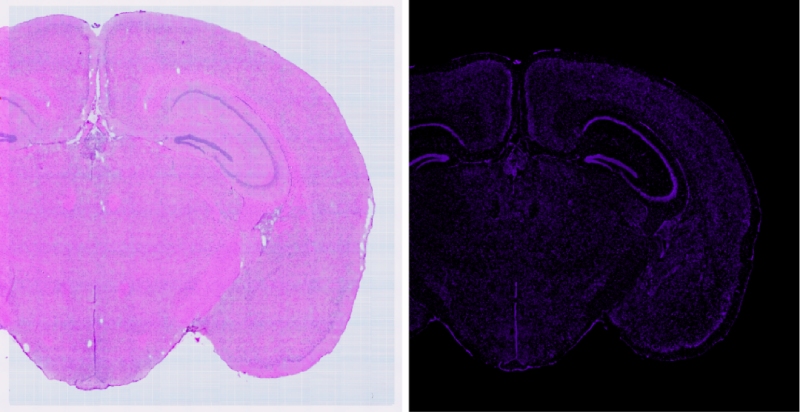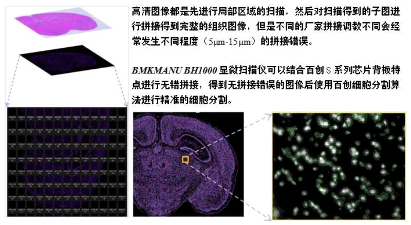 可以利用BH1000對明場及熒光掃描過程中經常出現的拼接錯誤進行校準(自主研發BMCHiper軟件,搭配自研半透半返模塊,實現圖像無錯校準),得到原片無錯高清的熒光圖像與原片無錯高清的明場圖像,為后續空間數據準確的定位和可視化提供基礎,使得復雜的轉錄組數據能夠轉化為最直觀,最精準的生物學見解。