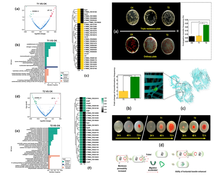 納米塑料暴露顯著提高粘質沙雷氏菌的接合轉移頻率(T2 組 22.98%、T1 組 8.13%、CK 組 7.35%)和游離質粒轉化能力(T2 組轉化頻率是 CK 組的 6 倍,T1 組是 CK 組的 2 倍),且轉移的質粒攜帶多種抗性基因和外排泵基因。
