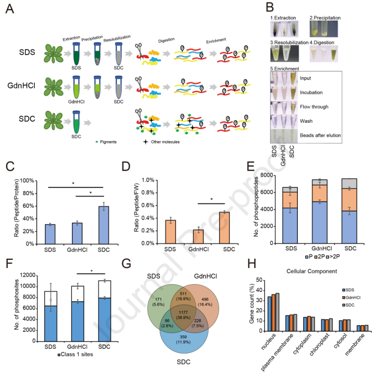 蛋白質磷酸化在植物的生長、發育、環境適應以及作物的產量和品質調控中發揮著重要的作用。深度解析磷酸化蛋白質組是全面理解磷酸化如何行使功能的有效手段。然而,與動物相比,植物磷酸化蛋白質組的深度解析在技術上更具挑戰性。因為植物細胞具有致密的細胞壁和大量的包括色素在內的次生代謝物,前者極大地增加了蛋白質提取的難度,而后者嚴重地干擾了磷酸肽富集的效率和特異性。