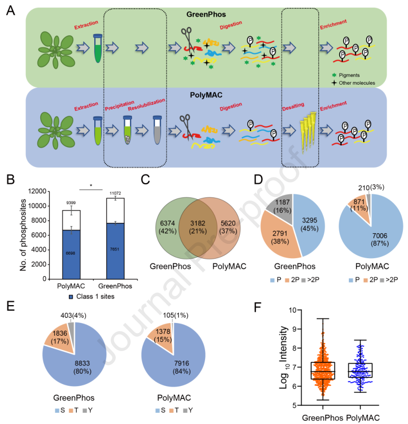 2023年11月27日,中國科學院遺傳與發育生物學研究所汪迎春團隊在Molecular Plant在線發表了題為GreenPhos, a universal method for in-depth measurement of plant phosphoproteomes with high quantitative reproducibility?的研究論文。論文中報道了一種具有突破性的植物磷酸化蛋白質組學新技術。該技術采用了簡化、穩健的工作流程,有效地克服了植物磷酸化蛋白質組分析的主要技術難點,能高靈敏度、高特異性快速地富集植物磷酸肽。利用該技術可定量分析不同植物的磷酸蛋白質組,其分析深度之深、定量重復性之高前所未有,有望成為植物磷酸蛋白組學的通用技術。由于該技術主要面向高等植物及其它綠色生物(如衣藻),且操作簡便,極大地降低了實驗所需的人力和試劑費用,因此命名為GreenPhos (綠磷)。