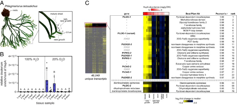為了指導對石松生物堿生物合成的研究,作者重點關注 HupA,因為它已知具有作為 AChE 抑制劑的活性和作為藥物的潛力。HupA 由石松屬內的物種產生,但這些物種的 HupA 積累水平差異很大。作者推斷物種中 HupA 的增加可能與上調的生物合成基因表達有關。因此,檢測了石松屬的幾個物種的 HupA 含量,結果發現P. tetrastichus(圖 2A)積累了 HupA 到最高水平。因此,后續的研究將集中在該物種上。之前的研究表明,從頭 HupA 生物合成對P. tetrastichus枝條的新生長具有特異性,接著作者通過氘同位素標記實驗得到驗證,并且發現與莖相比,HupA標記在葉中更廣泛分布,表明這里的生物合成基因表達富集(圖2B)。因此,作者對對該物種的多個組織進行了RNA-seq分析,揭示石杉生物堿生物合成基因在活性組織中的積累機制。