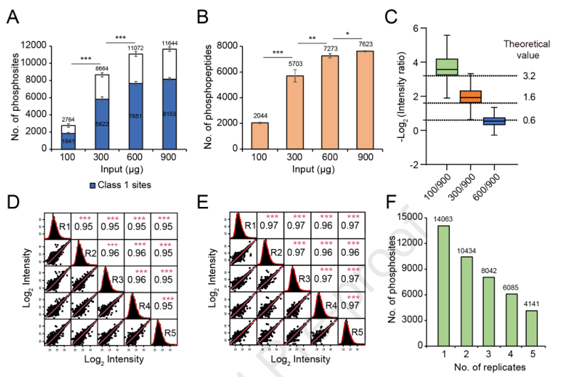 為了評估GreenPhos在定量磷酸化蛋白質組學中的潛力,作者了鑒定的磷酸化肽與上機量之間的定量關系。以900μg為參照,在100、300和600μg中,檢測到的磷酸肽強度比與參考中磷酸肽強度比的中位數與理論值具有很好的相關性(圖3C)。分析結果表明,GreenPhos與單次LC-MS結合可用于從高達600μg的蛋白質中定量磷酸肽,準確度高。通過5次重復質譜分析,評價了GreenPhos在植物磷蛋白組定量鑒定中的再現性。5個生物重復和5個技術重復的磷酸肽強度的Pearson相關系數平均分別為0.95和0.97 (圖3D和3E),表明具有較高的定量可重復性。從5個生物重復中共鑒定出磷酸化位點14063個,其中74%的磷酸化位點至少在2個重復中鑒定出 (圖3F)。結果表明,GreenPhos可以在定量和定性上產生高度可重復性的結果。