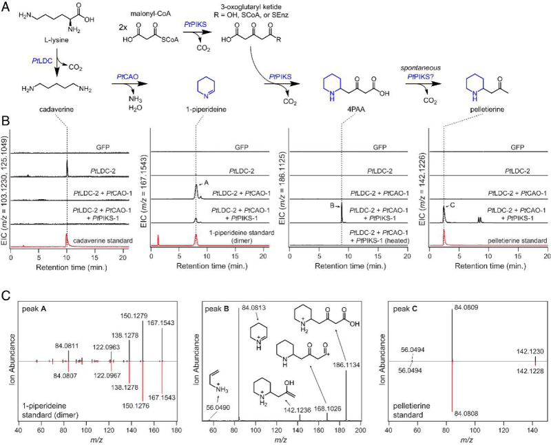 接下來,推測通過向 1-哌啶聚合物中添加丙二酰輔酶 A 衍生的聚酮鏈以產生 4-(2-哌啶基)乙酰乙酸(4PAA),該酸可以脫羧產生peletierine(圖 1B)。聚酮底物的產生表明聚酮合酶(PKS)酶參與催化這種亞胺-酮縮合反應,并在石松生物堿的生物合成中起作用。進一步分析揭示了兩個PKS候選基因(PtPIKS-1和PtPIKS-2),與PtLDC-1共表達基因之一(圖2C)。PtPIKS-1 PtPIKS-2與PtLDC-2 和PtCAO-1在煙草葉片中的瞬時共表達導致1-哌啶代謝物的消耗和幾種新化合物的產生。其中一種化合物具有與假定的石松生物堿前體peletierine相對應的精確質量數 ([M+H]=m/z