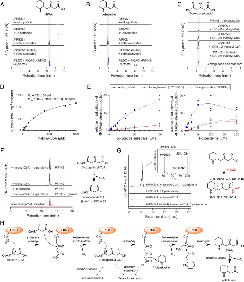 研究報道指出,在石松屬和托烷生物堿生物合成中觀察到的亞胺-酮縮合是通過 3-氧代戊二酸與環亞胺共底物的非酶促脫羧縮合發生的。盡管這種非酶縮合是可能的,但作者想進一步評估3-氧代戊二酸作為生物合成中間體的相關性。為此,比較了在含有PtPIKS-1的體外反應中將3-氧代戊二酸或丙二酰輔酶A與1-哌啶配對時 4PAA/peletierine生產的反應速率。雖然觀察到1-哌啶和3-氧代戊二酸在低水平下自發縮合,但當丙二酰輔酶A作為與1-哌啶的共底物時,產物形成速率顯著增加(圖4E)。此外,在測量的底物濃度(2至200μM,圖4E),而丙二酰輔酶 A 和 1-哌啶之間的縮合顯然是酶依賴性的(圖4A和B)。因此,雖然1-哌啶和3-氧代戊二酸之間的自發縮合可以在低水平下發生,但這些數據支持一個model,其中PIKS催化的縮合發生在1-哌啶和源自丙二酰輔酶A的聚酮硫酯之間。為了支持這一結論,當丙二酰輔酶A作為PtPIKS-1的底物在體外被納入時,可以檢測到累積的乙酰乙酰輔酶A(圖4F)。乙酰乙酰輔酶A的積累雖然是間接的,但表明會產生一種3-氧代戊二酰輔酶A代謝物,該代謝物會迅速發生脫羧。作者無法直接檢測3-氧代戊二酰輔酶A,并推測這是由于這種中間體的瞬時、不穩定性質所致。有趣的是,乙酰乙酰輔酶A與1-哌啶發生酶非依賴性縮合,產生peletierine。然而,這種縮合不會產生4PAA,因此其在石松生物堿生物合成中的相關性尚不清楚。
