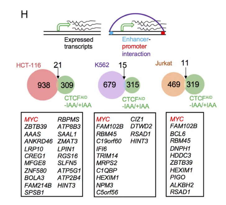 CTCF基因啟動子的染色質可及性在CTCF耗竭時也有所增加(圖3D),這一點通過定量PCR (Q-PCR)進一步得到驗證(圖3E)。這些數據表明CTCF可以抑制自身以保持最*表達水平。對于CTCF耗竭后被下調的基因,如MYC,并沒有在啟動子區域檢測到有統計學意義的染色質可及性變化。因此,當啟動子區域保持開放時,遠端增強子區域的染色質景觀變得更難以接近,再加上CTCF耗竭,可能在控制能調控MYC轉錄的遠端增強子-啟動子loop環的形成中發揮作用。