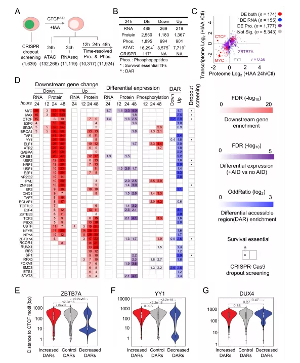 本文開發了一種多組學聯合的方法來定義CTCF共調控轉錄因子,總共鑒定了40個CTCF共同調控因子,這些TF在急性CTCF耗竭時在mRNA和/或蛋白質水平上顯著影響其下游靶基因的表達(圖6D)。正如預期的那樣,這40個CTCF共調控因子中的大多數也在CTCF介導的DARs中有共同定位,證實了它們與CTCF有著潛在的直接共同調控作用。