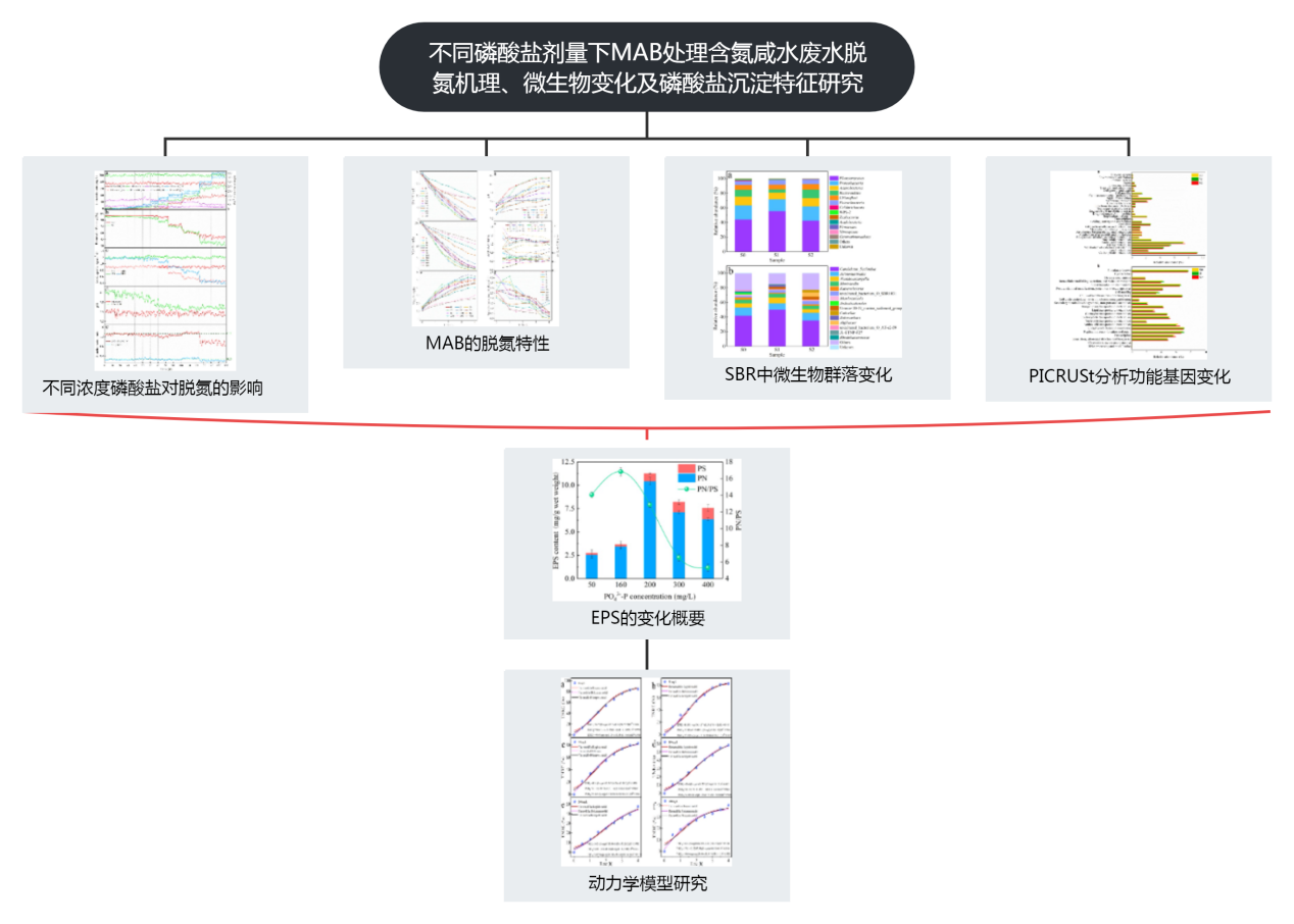 本研究首次探索了含氮含鹽廢水中不同磷酸鹽劑量下MAB的脫氮工藝。MAB的活性在含低濃度磷酸鹽時(0-30 mg/L)增強,高濃度時(160~400 mg/L),NH4+和NO2-的去除率下降,MAB相對豐度下降了15.4%。此外,沉積物的存在迫使微生物產生更多的EPS以保護自己免受損害。通過低濃度磷酸鹽促進MAB的厭氧氨氧化過程或對含氮含鹽廢水脫氮處理有重大意義,SBR中磷酸鈣鎂沉淀的形成,或許為磷元素的回收提供了思路。