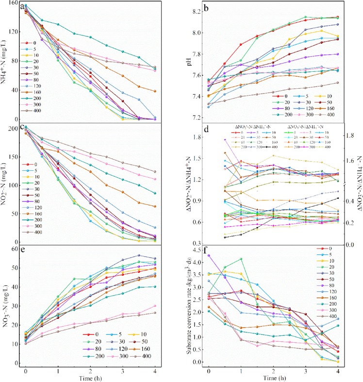 在本研究中,當磷酸鹽濃度超過160 mg/L時,氮和磷酸鹽的物質平衡被打破,隨著KH2PO4用量的進一步增加,進水pH值顯著下降。為了使進水pH值保持在7.5,加入氫氧化鈉進行酸堿中和。隨著氫氧化鈉的注入,在液相中觀察到白色絮狀沉淀。此外,隨著磷酸鹽用量的增加,所需的氫氧化鈉濃度也增加,產生更多的白色絮狀沉淀物,這些白色沉積物會粘附在生物膜上并延遲底物滲透到內部生物質中,正是由于這些非織造膜載體的存在,MAB可以富集成致密致密的生物膜,而不是漂浮和松散的顆粒。因此,MAB的新細胞不能以被沉淀覆蓋的顆粒為核,形成更大的顆粒。