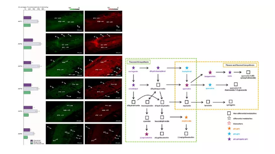 為了確定FR階段的代謝變化,作者基于廣靶的LC-MS/MS對野生枇杷和栽培枇杷進行了代謝組研究,共鑒定出1040種代謝物,利用層次聚類分析(HCA)和主成分分析(PCA)對4種枇杷果實的代謝產物進行了分類,發現野生枇杷和栽培枇杷在果實發育過程中代謝產物譜存在顯著差異。Jinhua No. 2 FR與GZ-23 FR的代謝組學分析顯示,共有371個差異積累代謝物(DAMs),其中149個上調,222個下調(圖6D)。但是野生枇杷中一些重要的類黃酮類化合物均顯著上調。Huabai No. 1 FR與GZ-White FR比較,共有413個DAMs表現出顯著差異,其中上調63個,下調350個(圖6C)。其中,鼠李糖、棉子糖、D-葡萄糖、D-半乳糖、D-甘露糖和肌醇在白肉枇杷中顯著上調。有機酸中,茉莉酸和2-吡啶甲酸在白葉枇杷中顯著上調(圖6E)。