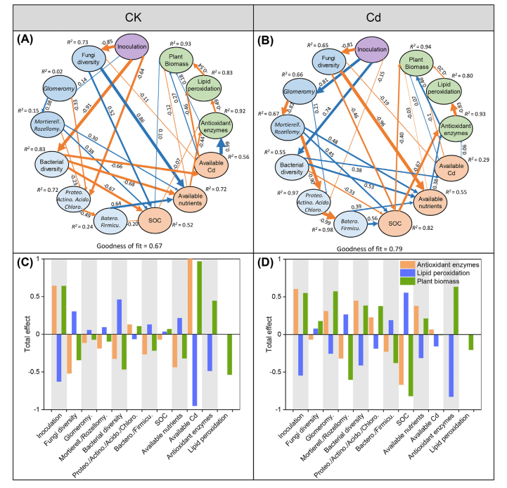 圖5 處理(接種和添加Cd)與微生物群落、土壤特性和植物抗性的級聯關系。偏最小二乘路徑模型(PLS-PM)剖析了處理、微生物群落和土壤特性對植物抗性的主要影響途徑(A)(B);以及每個變量對植物生物量、抗氧化酶和脂質過氧化物的總影響(C)(D)。