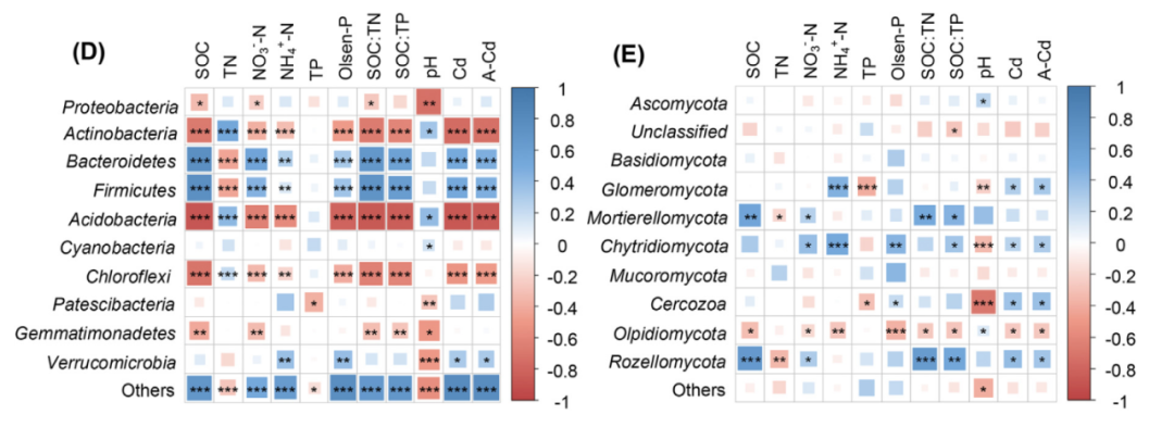 VPA的結果表明,土壤性質和Cd含量一般能解釋細菌群落的大部分變化(62.8%),而它們只能解釋真菌群落12.9%的變化(圖4A和B)。Mantel檢驗和相關分析表明,除TP和SOC:TP外,其他土壤變量均與細菌群落顯著相關,而只有Olsen-P和pH值對真菌群落有顯著影響(圖4C)。此外,RDA還證實,與不同處理的真菌群落相比,土壤變量對不同處理的細菌群落有更明顯的影響。根據相關性熱圖和RDA或CCA,細菌群落中的Actinobacteria、Bacteroidetes、Firmicutes、Acidobacteria和Chloroflexi與除TP外的其他土壤變量顯著相關(P<0.05;圖4D)。然而,在真菌群落中,只有Chytridiomycota、Olpidiomycota和Rozellomycota與大多數土壤變量表現出明顯的相關性(P <0.05;圖4E)。