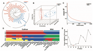 對26個典型的枇杷栽培種質資源(代表全球不同地區的栽培種質資源)和11個來自中國西南地區的野生種質資源進行了全基因組重測序,平均深度為22.49×,共鑒定出10,978,138個高質量的SNP。系統發育和主成分(PCA)分析表明,野生種質和栽培種質聚為兩個不同的組(圖3A和B)。野生枇杷的核苷酸多樣性(π)(2.28×10?3)高于栽培枇杷(1.44×10?3),LD衰減速度快于栽培枇杷(圖3C),期望雜合度和觀測雜合度的平均值均顯著高于栽培枇杷。進一步利用Structure對種群結構分析顯示,當K=2時,所有個體被清楚地細分為野生和栽培種質的兩個特定分支(圖3D)。