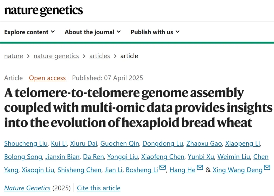 2025年4月7日,濰坊現(xiàn)代農(nóng)業(yè)山東省實驗室/北京大學(xué)現(xiàn)代農(nóng)業(yè)研究院和小麥育種全國重點實驗室鄧興旺、何航、李博生團隊在國際頂尖期刊《自然-遺傳學(xué)》(Nature Genetics)上發(fā)表題為“A telomere-to-telomere genome assembly coupled with multi-omic data provides insights into the evolution of hexaploid bread wheat”的突破性成果:成功繪制了六倍體小麥的端粒到端粒(T2T)完整基因組圖譜,實現(xiàn)了小麥基因組從“頭”到“尾”無缺口的精確組裝。這一在山東完成的成果,為我國主糧作物高水平科技自立自強、牢牢把握糧食安全主動權(quán)提供了重要支撐。