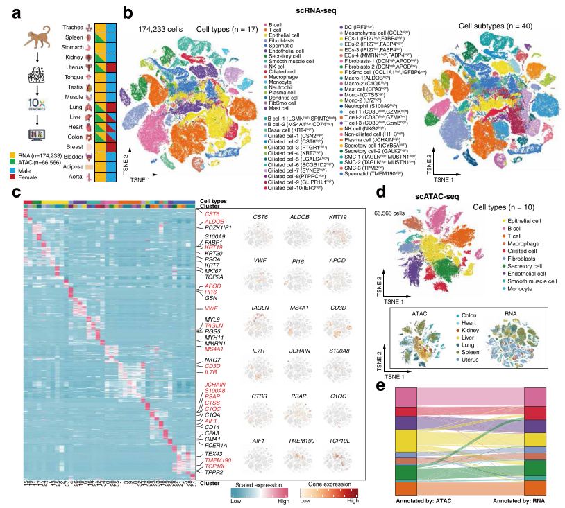 該研究對成年食蟹猴的16個代表性器官進行單細胞轉錄組測序和單細胞染色質開放性測序,構建了食蟹猴多器官的單細胞多組學參考圖譜,將25萬個細胞進行 t-SNE降維聚類得到40余種不同的細胞亞群。