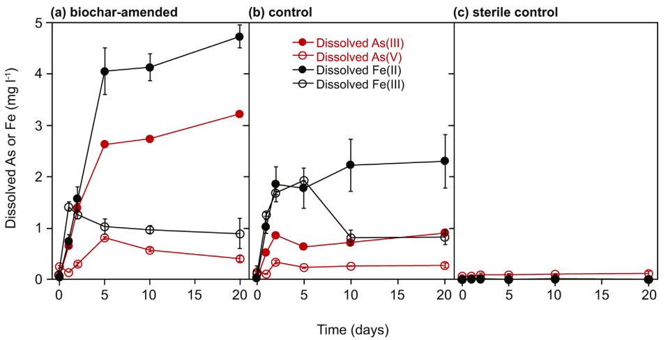 從圖1a和1b來看,生物炭修正的水稻缺氧土壤中,Fe(III)的還原與As(V)的解吸或釋放均被促進,As(III)的濃度與Fe(II)的濃度密切相關,Fe(III)和As(V)的降低是同時發生的;從圖1c來看,在整個孵育期間,無菌土壤中均未觀察到鐵和砷的明顯釋放,表明鐵和砷的降低是由微生物導致的。