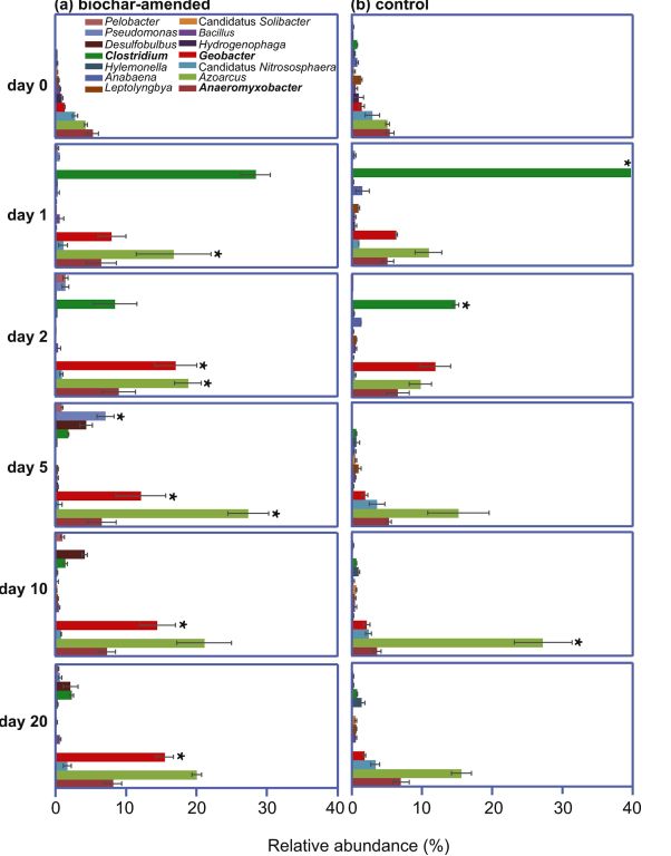 在生物炭修正組中,地桿菌(geobacter)相對轉錄豐度顯著高于對照組(無生物炭修正組)(圖4a),表明生物炭顯著提高了水稻土壤中地桿菌(geobacter)的轉錄活性。此外,生物炭對孵育初期的厭氧粘細菌(Anaeromyxobacter)和希瓦氏菌(Shewanella)的轉錄也有積極影響,然而抑制了對菌(clostridium)的轉錄水平(圖4b-d)。